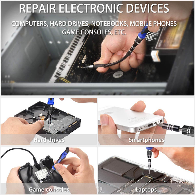 🔨【Electronic screwdriver kit available for Laptop & Cell Phones accessories】 Screwdriver flexible extension is available for narrow corners. It is also equipped with anti static tweezers and non-slip silicone handles for all occasions. It can be used for electronics,iphone,watch ,glasses,laptop,Jewelers and home appliances such as televisions, air conditioners, etc. This tool kit can really satisfy your daily needs.
