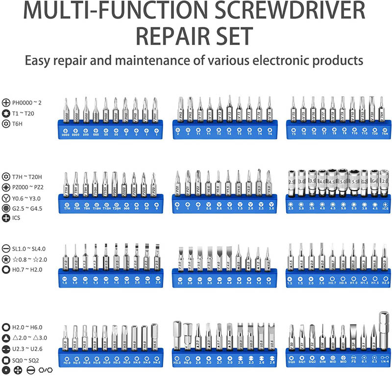 🔨【Higher hardness 55HRC, More Durable】This small precision screwdriver set consists of 120 pcs screwdriver bits that made of Cr-V Steel(55 HRC hardness). The mini screwdriver set's bits include T1,T2,T3,T4,T5,Security hex T6,T8,T9,T10,T20,Tri-wing Y0.6,Y1.5,Y2.0,Y3.0, PH0000,PH000,PH00,PH0,PH1,PH2, STAR0.8,1.2,1.5,2.0, G3.8,G4.5, Tri-angle2.0,2.3,2.7,3.0. The bit of this precision repair tool kit with good quality assurance and operability.