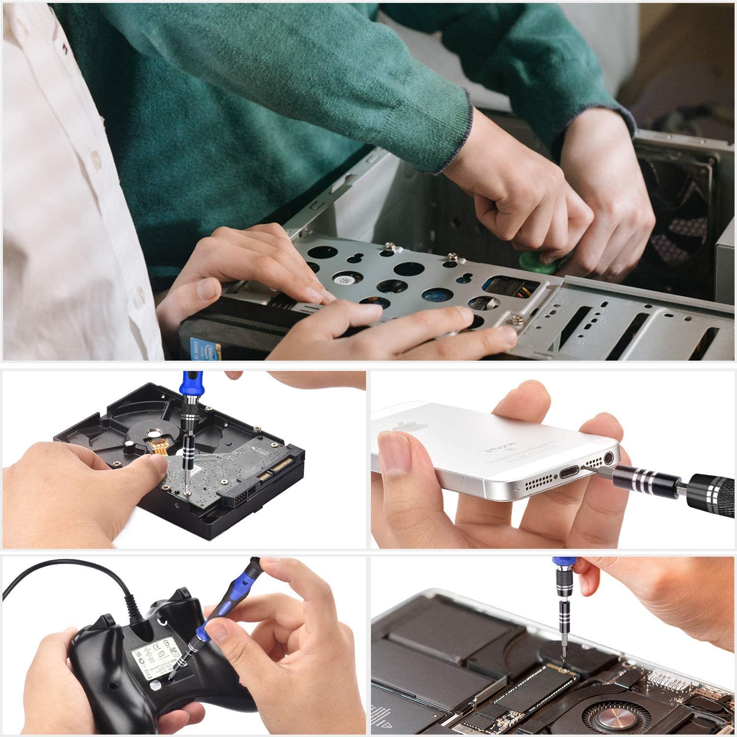 ►Improve Maintenance Efficiency: Professional computer repair kit with 24 utility tools. The flexible shaft can bend freely in the narrow and hard-to-reach area. Antistatic wristbands protect your electronic devices safer. Three tweezers are plated resistive ESD coating, which prevents static damage to electronic components. The attached magnetizer can strengthen the magnetism of screwdriver bits easily.