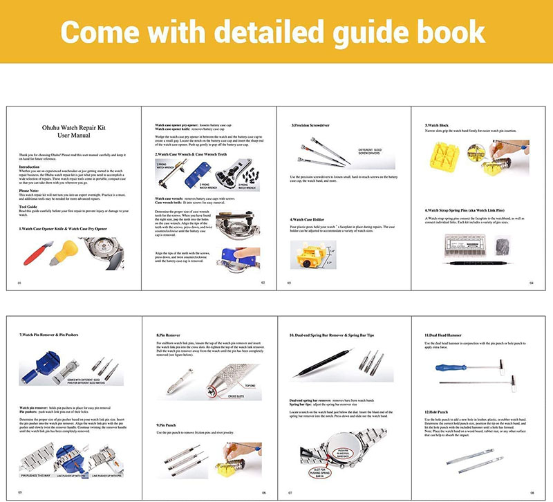 | Included Components | 1 x Adjustable Case Opener 18 x Adjustable Case Opener Pins, 1 x Watch Case Opener Knife, 1 x Stainless Steel Tweezer, 1 x Spring Bar Tool, 2 x Spring Bar Tool Spare Tips, 108 x Watch Strap Spring pins, 1 x Hammer, 1 x Link Remover, 3 x Link Remover Spare Pins, 2 x Link Remover Spare Pins (golden), 1 x Watch Case Holder (for watch case 10-45mm diameter ), 1 x Watch back pry opener (with yellow ergo handle), 3 x Precision Anti-magnetic Screwdrivers (1.2mm/0.047in, 1.4mm/0.055in, 1.6mm/0.063in), 3 x Pin Punches (0.8mm/0.031in, 0.9mm/0.035in, 1.0mm/0.039in), 1 x Carrying Case |